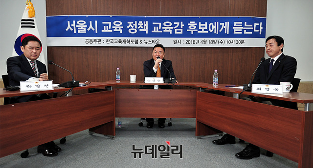 6월 지방선거 서울시교육감에 출사표를 던진 곽일천 예비후보가 18일 오전 서울 중구 서울시의회 제2대회의실에서 열린 최명복 후보와의 정책 토론회에서 인사말을 하고 있다. 이날 토론회는 손상윤 뉴스타운 회장의 사회로 뉴스타운 TV를 통해 생중계 된다.