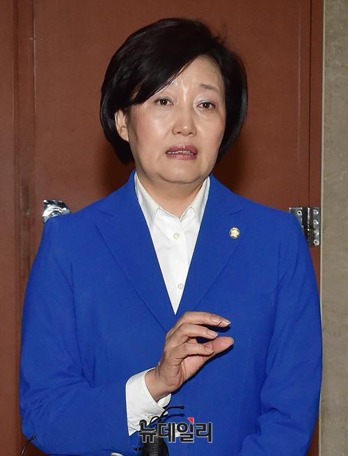 박영선 더불어민주당 서울시장 예비후보가 18일 오전 국회에서 정론관 후보경선과 관련해 기자회견을 마치고 기자들의 질문에 답하고 있다.