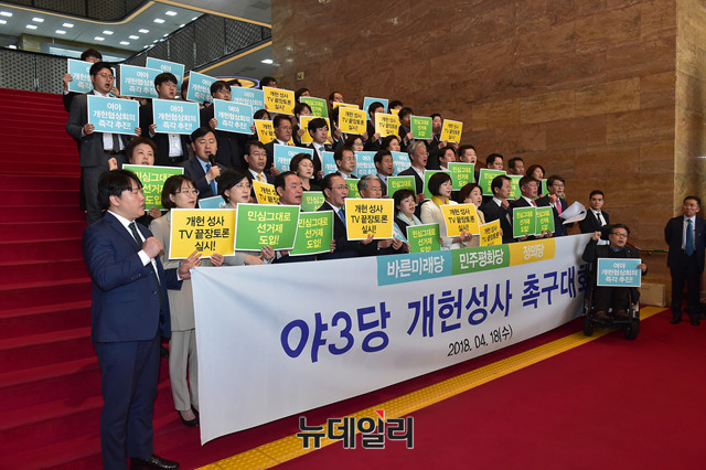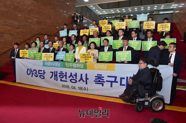 바른미래당-민주평화당-정의당 야3당 의원들과 당직자들이 18일 오전 국회 로텐더홀에서 개헌 성사 촉구대회를 열고 구호를 외치고 있다.