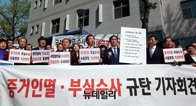 김영우 민주당원댓글조작 진상조사단장이 19일 오전 서울 종로구 서울지방경찰청 앞에서 열린 '드루킹' 등 민주당원 댓글조작 사건 관련 '증거인멸·부실수사 규탄 기자회견 및 비상의원총회'에 참석해 '드루킹 사건 7대 의혹'이 적힌 팻말을 들고 발언하고 있다.이날 규탄대회에 참석한 자유한국당 의원들은 "증거인멸 부실수사 서울청장 각성하라", "국정원 댓글 수사하듯 댓글 공작 철저히 수사하라" 등의 구호를 외친 뒤 이주민 서울경찰청장과 면담하기 위해 청사안으로 이동했다.