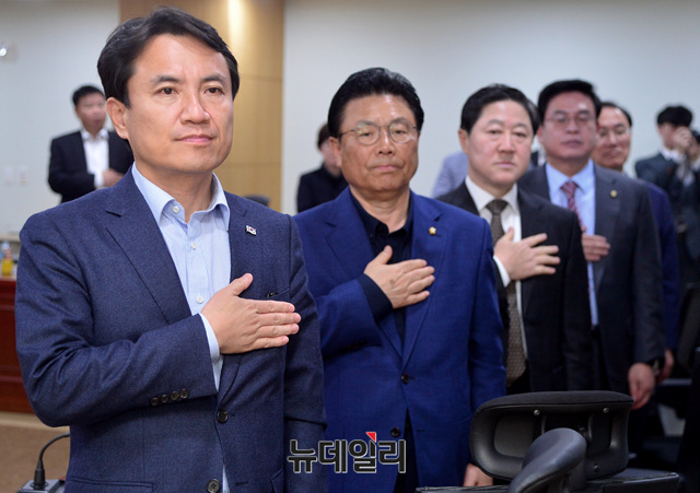 [포토] 보수의미래 포럼, 국민의례 하는 김진태
