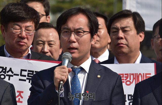 자유한국당 댓글조작 진상조사단 단장인 김영우 의원이 20일 오전 서울 종로구 청와대 분수대 앞에서 열린 의원총회에서 '드루킹 댓글공작' 관련 발언을 하고 있다.