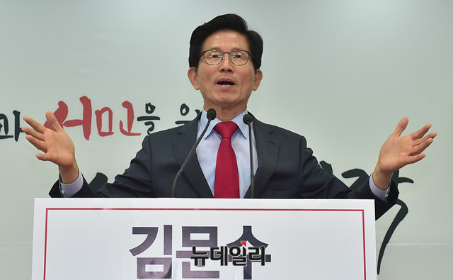 김문수 자유한국당 서울시장 후보가 24일 오전 서울 여의도 중앙당사 기자실에서 교통관련 3차 공약을 발표하고 있다.