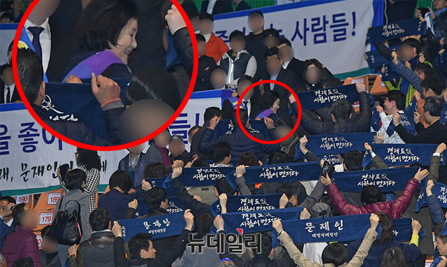 지난해 3월 31일 부산 연제구 부산실내체육관에서 열린 더불어민주당 제19대 대통령후보자 영남권역 선출대회에서 당시 문재인 후보의 부인 김정숙 여사가 '경인선(經人先)' 회원들이 모여 있는 자리를 찾아 악수를 나누고 있다.앞서 청와대는 김정숙 여사가 지난해 대통령후보자 선출대회에서 경인선 회원을 응원하는 영상이 언론에 공개되자 '김 여사는 경인선을 모른다'는 취지로 관계성을 부인하는 해명을 전한 바 있다.