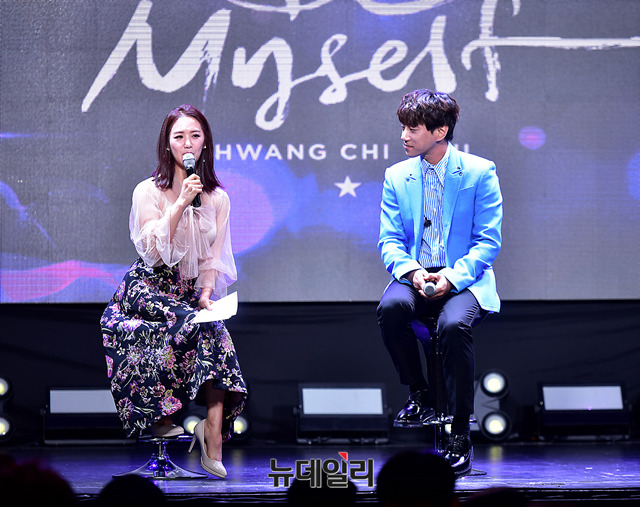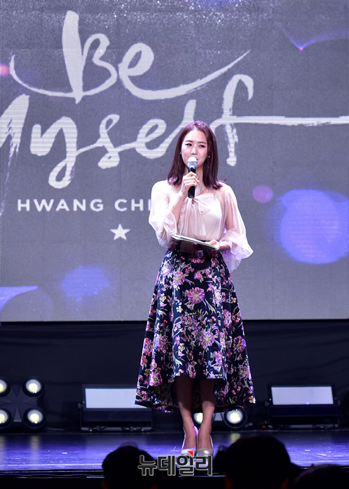 이지애 아나운서가 24일 오후 서울 마포구 홍대무브홀에서 열린 가수 황치열의 2번째 미니앨범 'Be Myself(비 마이셀프)' 쇼케이스에서 황치열을 소개하고 있다.