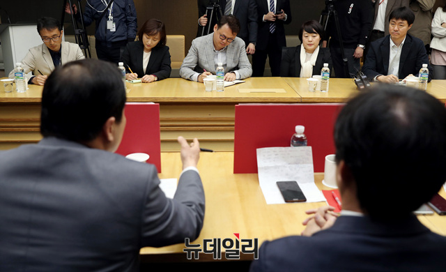 김성태 자유한국당 원내대표가 25일 오전 경기 성남시 분당구 네이버 앞에서 열린 비상 의원총회 후 한성숙 네이버 대표와 면담하고 있다.