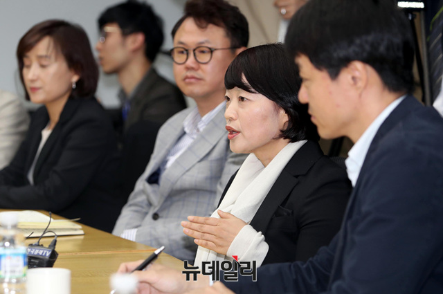 한성숙 네이버 대표가 25일 오전 경기 성남시 분당구 네이버에서 김성태 자유한국당 원내대표와의 면담에 참석해 질문에 답하고 있다.