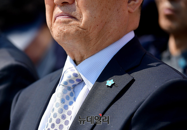 6.25전쟁납북인사가족협의회 한 참가자가 25일 오후 청와대 앞 분수대에서 가진 남북정상회담, 납북피해 문제 공식 의제 채택 촉구 기자회견에서 물망초 배지를 가슴에 달고 국민의례를 하고 있다.