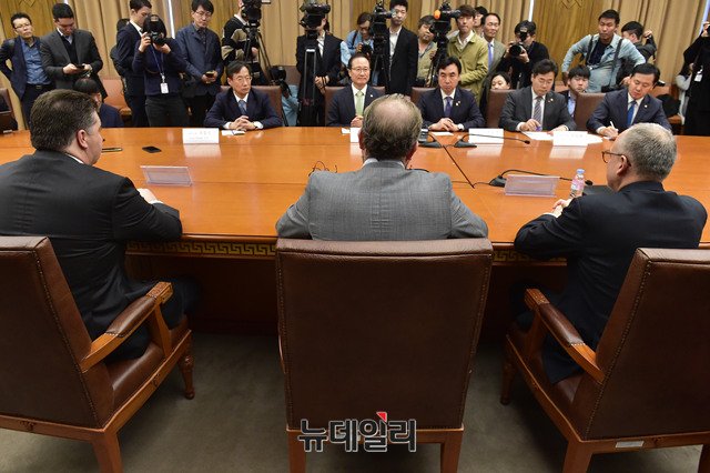 홍영표 더불어민주당 한국지엠 대책특별위원회 위원장, 댄 암만 GM 총괄사장 등 참석자들이 26일 오전 국회접견실에서 열린 간담회에서 대화를 나누고 있다.