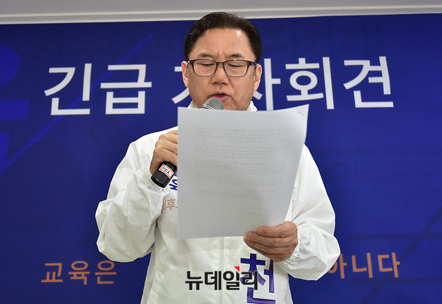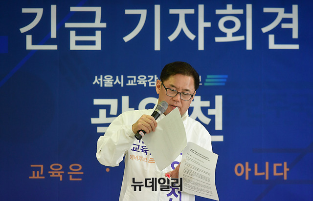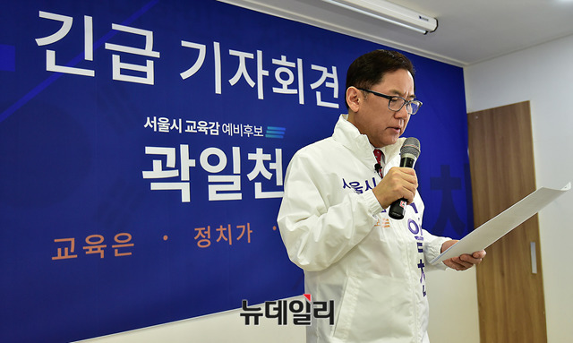 곽일천 서울시 교육감 예비후보가 26일 오후 서울 종로구 자유민주국민연합 회의실에서 긴급기자회견을 열고, 우파 교육감 단일화와 관련해 입장을 밝히고 있다.
