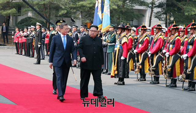 이어 두 정상은 예정된 국군의장대의 사열을 받았다. 붉은색 카페트 양측으로 국군의장대가 배치됐고, 두 사람은 사성곡·봉황곡의 연주를 들으며 지나갔다.의장대 사열은 국빈 방문 행사서 최상의 예우를 표하는 방식 중 하나다. 1946년 국군 창설 이래 적국 수장에게 의장대 사열을 진행한다는 강력한 비난이 일기도 했다.이번 사열은 공간 특성을 고려해 300명이 참가하는 정식 의장대 사열 대신 100여 명 규모의 약식으로 진행된 것으로 알려졌다.판문점 공동취재단 박영근 기자 [bokil8@newdailybiz.co.kr]