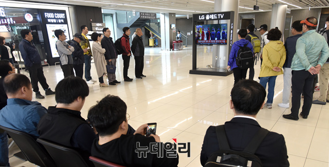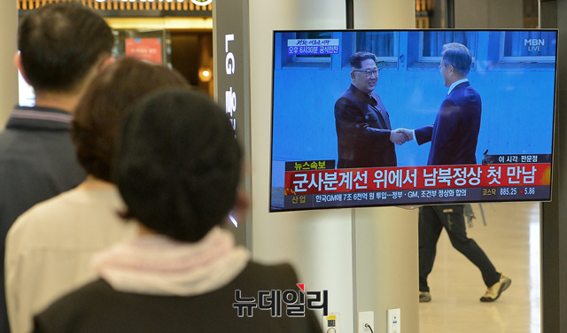 2018 남북정상회담이 열린 27일 오전 시민들이 서울 강서구 김포국제공항에서 생중계로 문재인 대통령과 김정은이 악수 나누는 모습을 보고 있다.