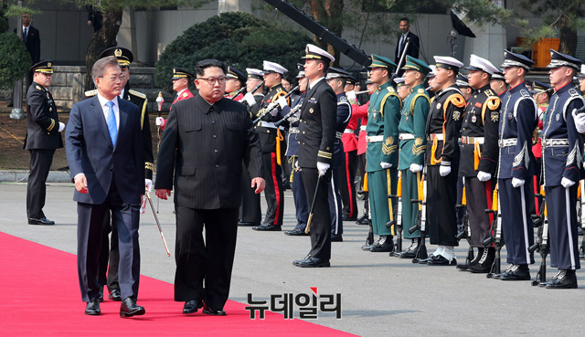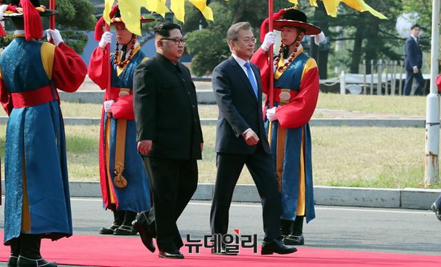 문재인 대통령과 북한 김정은이 27일 오전 판문점에서 의장대의 사열을 받고 있다. (사진=한국공동사진기자단)