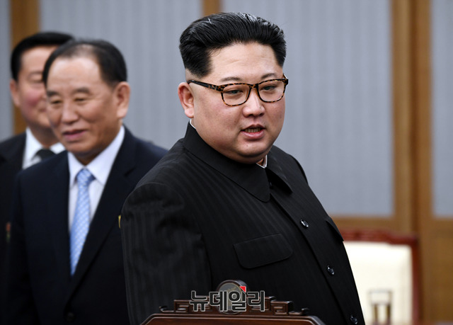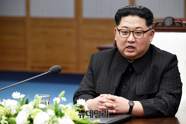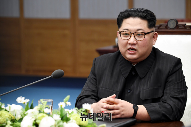 북한 김정은이 27일 오전 경기 파주시 판문점 평화의 집 2층 회담장에서 열린 남북정상회담에서 모두발언하고 있다. (사진=한국공동사진기자단)