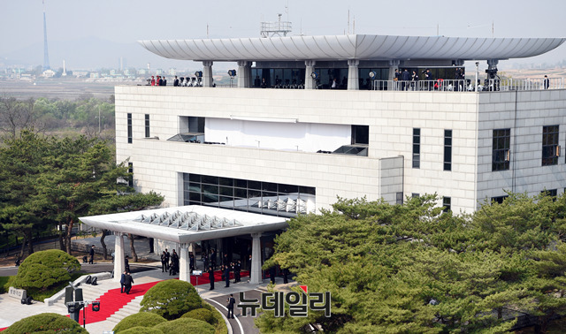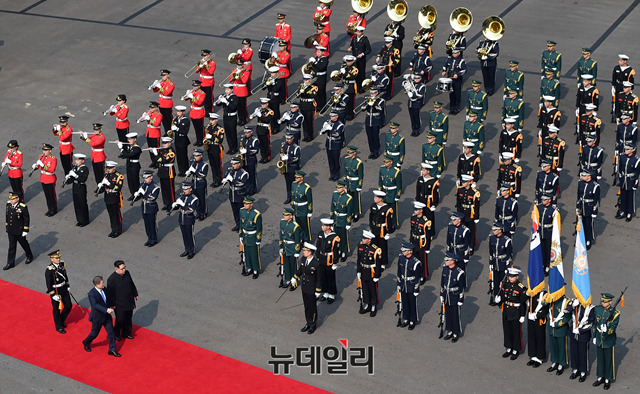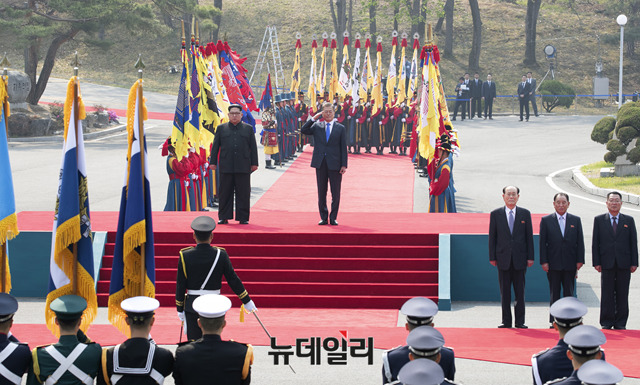 국군의장대가 27일 경기 파주시 판문점에서 군사분계선을 넘어온 북한 김정은을 맞기 위해 사열하고 있다. (사진=한국공동사진기자단)