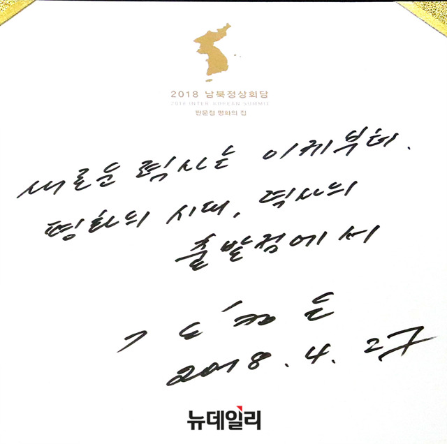 북한 김정은의 방명록 서명(새로운 역사는 이제부터. 평화의 시대, 역사의 출발점에서 김정은 2018. 4.27)