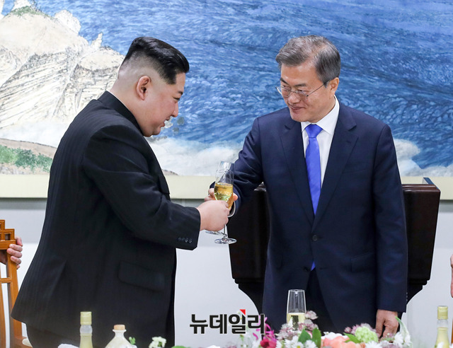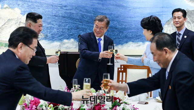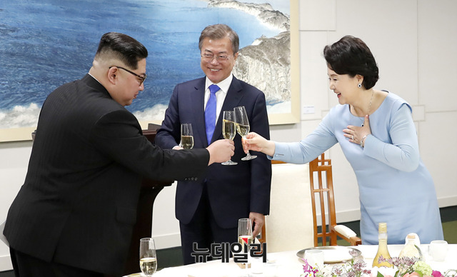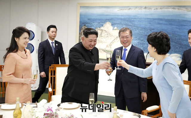 문재인 대통령이 27일 오후 판문점 평화의 집에서 열린 환영만찬에서 리설주와 건배하고 있다. (사진=한국공동사진기자단)