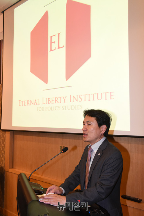김진태 자유한국당 의원이 28일 오후 서울 강남구 삼정호텔에서 열린 엘(EL)정책연구원 주최 '중국팽창의 위험과 한미일 동맹의 중요성 토론회'에서 축사를 하고 있다.