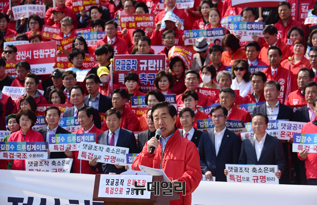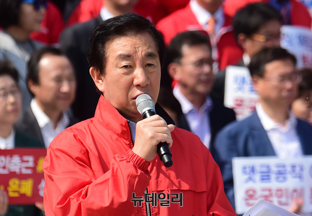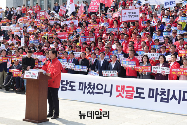 김성태 자유한국당 원내대표가 29일 오후 국회 본관 계단에서 열린 '댓글조작 규탄 및 특검 촉구대회'에서 모두발언을 하고 있다.