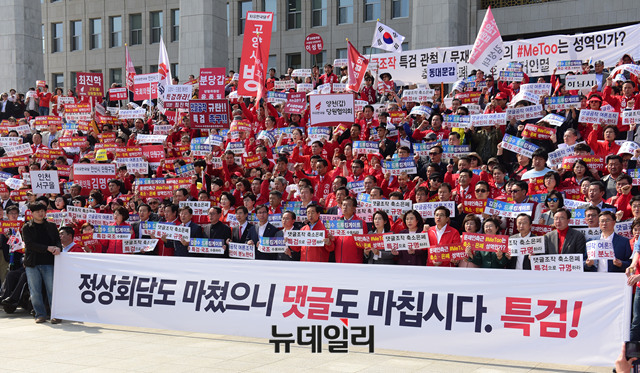 김성태 자유한국당 원내대표 등 소속의원, 참가자들이 29일 오후 국회 본관 계단에서 열린 '댓글조작 규탄 및 특검 촉구대회'에서 규탄구호를 외치고 있다.