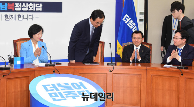 조명균 통일부장관이 30일 오전 국회 더불어민주당 대표실에서 열린 '4.27 남북정상회담'과 관련 보고회에 앞서 모두발언을 하고 있다.