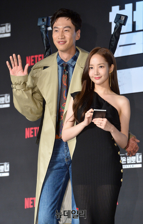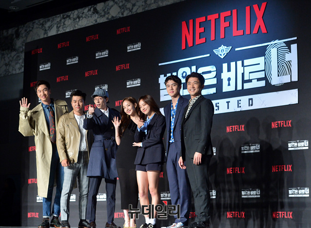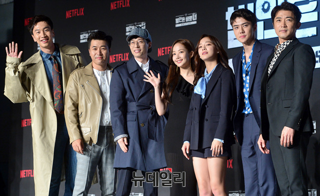 넷플릭스(Netflix) 예능 '범인은바로너!'의 배우들(유재석, 안재욱, 김종민, 이광수, 박민영, 엑소 세훈, 구구단 세정)이 30일 오후 서울 강남구 인터컨티넨탈 서울 코엑스에서 열린 제작발표회에 참석해 포즈를 취하고 있다.