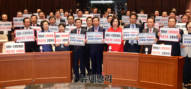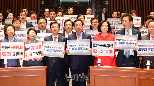 김성태 자유한국당 원내대표를 비롯한 참석의원들이 30일 오후 국회에서 열린 의원총회에서 구호를 외치고 있다.