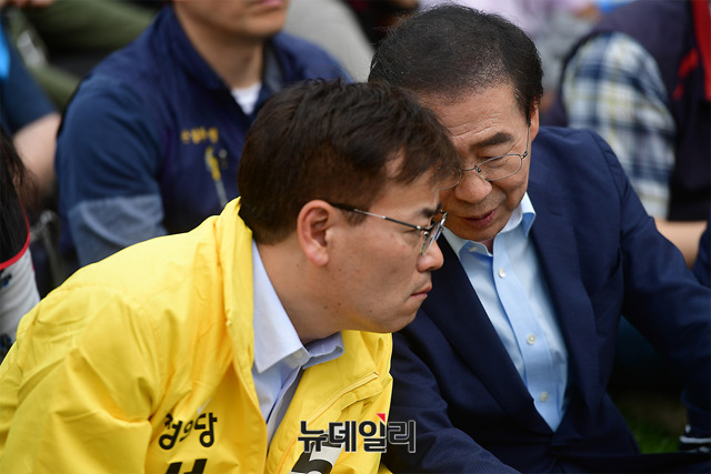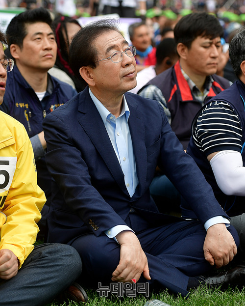 이정미 정의당 대표, 심상정 의원, 박원순 서울시장 등이 근로자의날인 1일 오후 서울광장에서 열린 민노총 주축의 노동절 대회에 참석해 자리하고 있다.