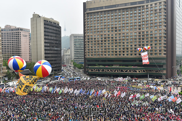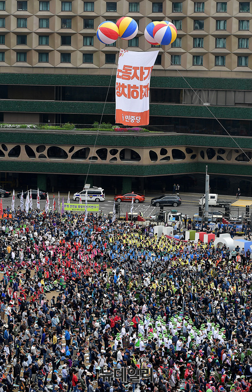 이날 민노총 대회는 근로자의 날을 맞아 '한국사회 노동을 새로 쓰자'를 주제로 서울, 부산, 광주, 대전 등 전국 14곳에서 개최되고 있다.
