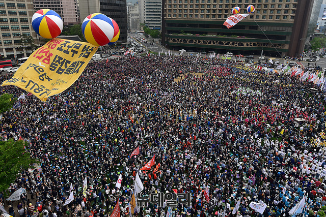 이날 민노총 대회는 근로자의 날을 맞아 '한국사회 노동을 새로 쓰자'를 주제로 서울, 부산, 광주, 대전 등 전국 14곳에서 개최되고 있다.