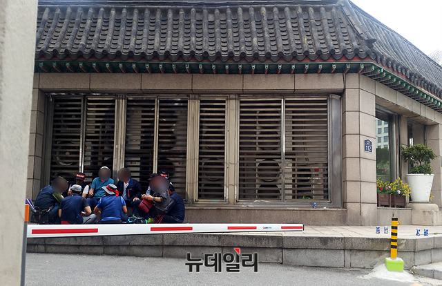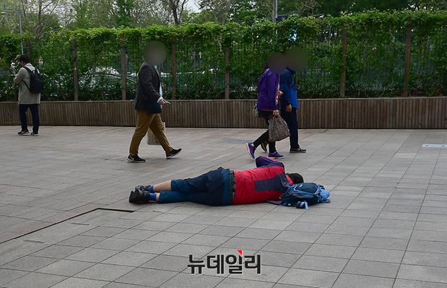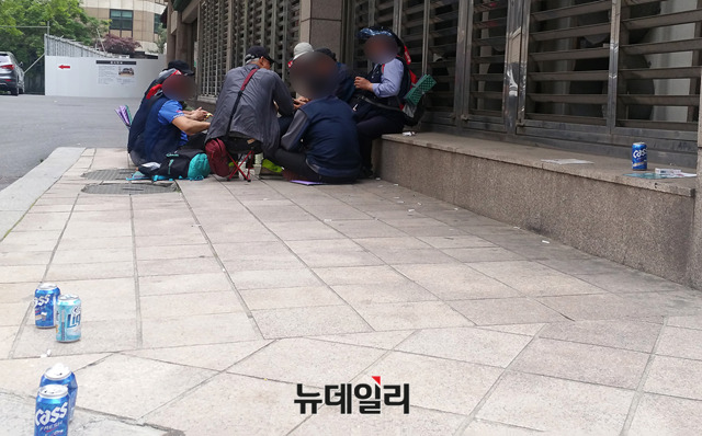 노동절대회 참가한 민노총 대회 참가자들이 1일 오후 서울광장에서 진행되고 있는 대회를 뒤로하고 문 닫은 점포 앞에 둘러앉아 술을 마시고 있다. 이날 대회에는 술마시고, 흡연하는 참가자들은 쉽게 발견할 수 있었다. 이들 가까이서 근무중인 경찰도 제지를 하지 않았다.