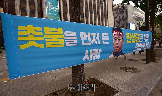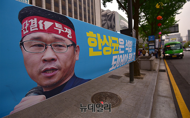 근로자의 날인 1일 오후 서울광장에서 민노총이 주축으로 노동절대회가 진행되는 가운데 세종대로 가장자리로 이석기와 한상균의 석방을 요구하는 현수막이 붙어있다.
