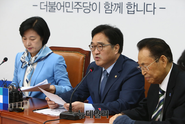 우원식 더불어민주당 원내대표가 2일 오전 국회에서 열린 최고위원회의에서 모두발언을 하고 있다.