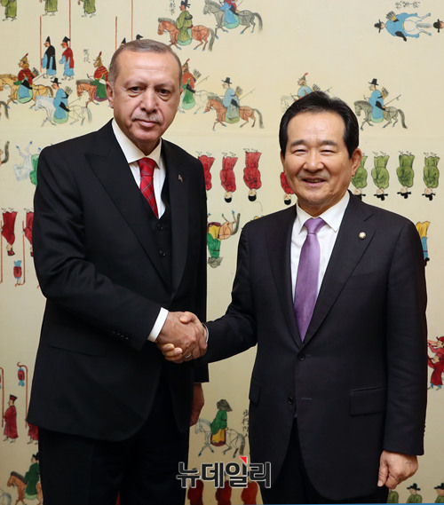 정세균 국회의장이 2일 오후 국회를 찾은 레제프 타이이프 에르도안 터키 대통령을 만나 악수를 나누고 있다. (사진=국회사진취재단)