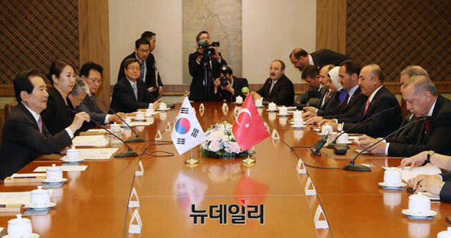 정세균 국회의장이 2일 오후 국회를 찾은 레제프 타이이프 에르도안 터키 대통령을 만나 대화를 나누고 있다. (사진=국회사진취재단)