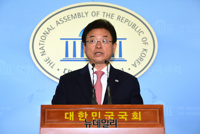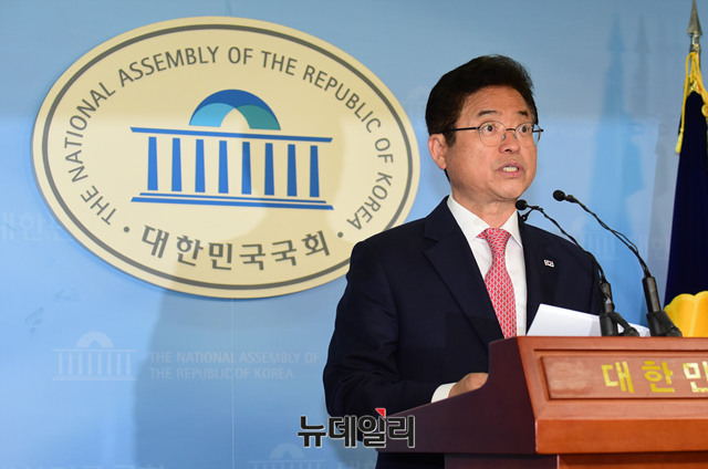 이철우 자유한국당 의원이 경북도지사 선거 출마를 위해 2일 국회 정론관에서 의원직 사퇴 기자회견을 갖고 있다.