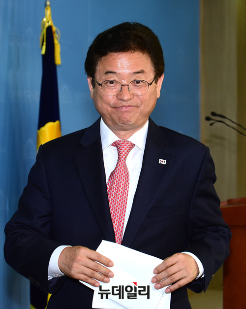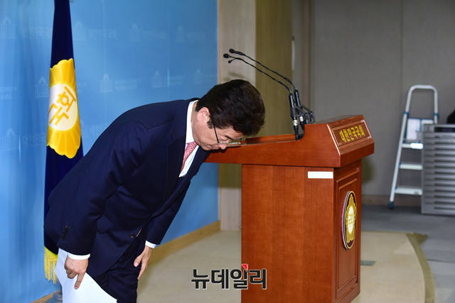 이철우 자유한국당 의원이 경북도지사 선거 출마를 위해 2일 국회 정론관에서 의원직 사퇴 기자회견을 마치고 회견장을 떠나고 있다.