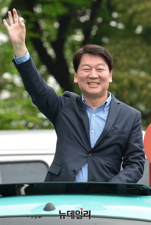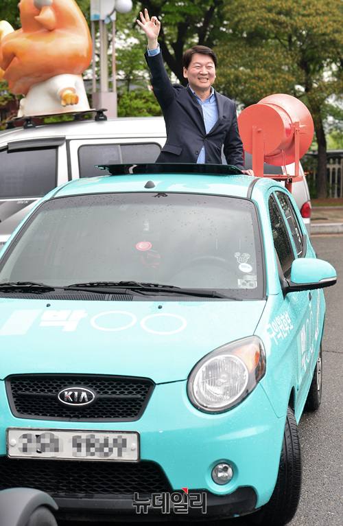안철수 바른미래당 서울시장 후보가 2일 오후 국회 헌정기념관 앞에서 열린 '돈 안 쓰는 선거 실천 대회'에 참석해 경차 유세차량을 타고 화이팅을 외치고 있다.