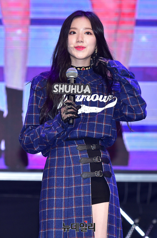 신인 걸그룹 (여자)아이들의 멤버 슈화가 2일 오후 서울 용산구 블루스퀘어 아이마켓홀에서 열린 데뷔 쇼케이스에서 포인트 안무를 선보이고 있다.