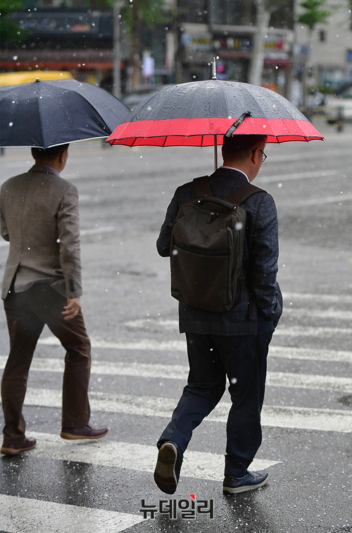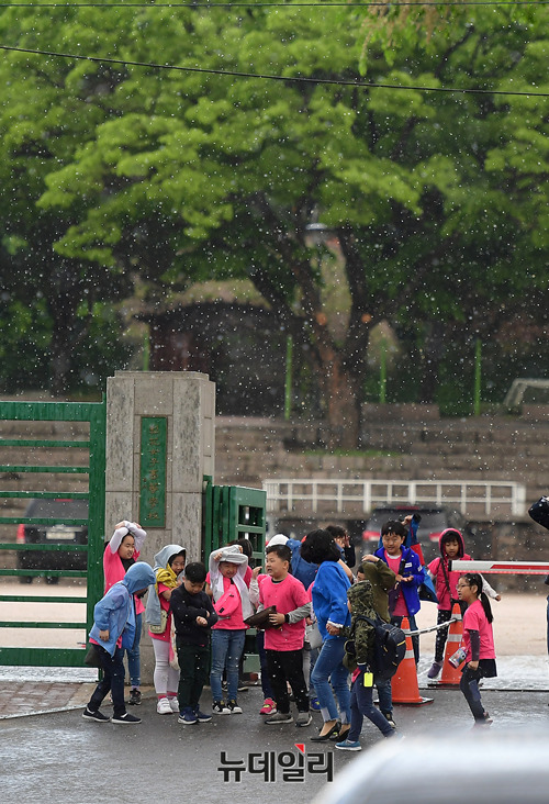 서울 서소문구의 한 초등학생들이 3일 오전 학교입구를 이동하는 중에 우박이 내리자 당황해하며 자리를 피하고 있다. 우박은 11시 20분쯤 시작돼 약 3분 가량 콩알만한 크기로 내렸다.