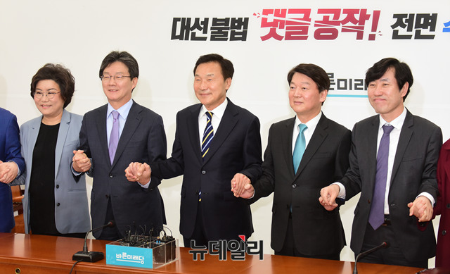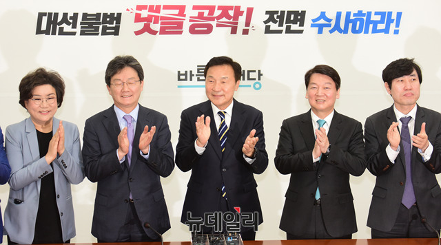 바른미래당 중앙선거대책원장을 맡은 손학규 전 국민의당 상임고문이 3일 오전 국회에서 열린 수락 기자회견에서 유승민 공동대표와 안철수 서울시장 후보와 함께 기념사진을 촬영하고 있다.