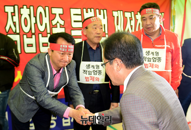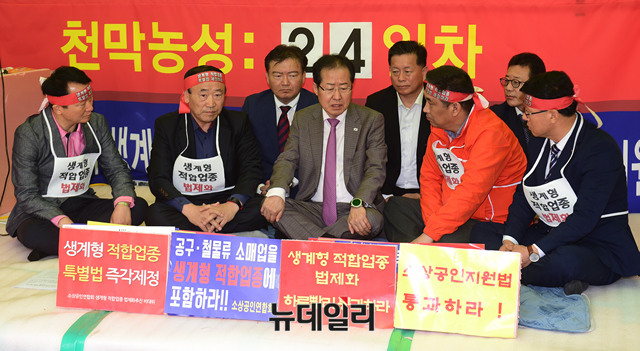 홍준표 자유한국당 대표가 3일 오전 서울 여의도 국회의사당 역 근처에서 소상공인 적합업종 특별법 제정을 촉구하며 농성중인 소상공인 연합회 회원들을 찾아 대화를 나누고 있다.