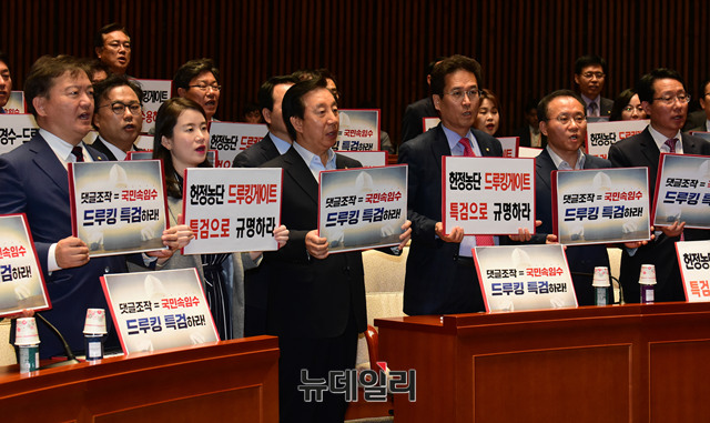 김성태 자유한국당 원내대표와 소속 의원들이 3일 오후 국회 예결위회의장에서 열린 의원총회에서 드루킹 특검을 촉구하는 구호를 외치고 있다.