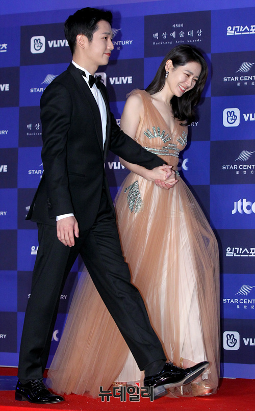 배우 정해인, 손예진이 3일 오후 서울 강남구 코엑스에서 열린 '2018 백상예술대상'에 참석해 포즈를 취하고 있다.