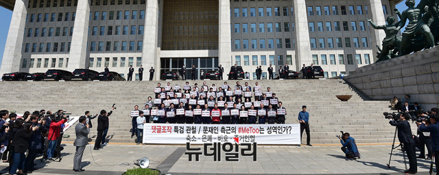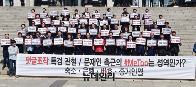 '드루킹 특검'을 촉구하며 단식 농성에 들어간 김성태 자유한국당 원내대표 등 소속의원들이 4일 오전 국회 본청계단에서 열린 비상의원총회에서 특검촉구 구호를 외치고 있다.