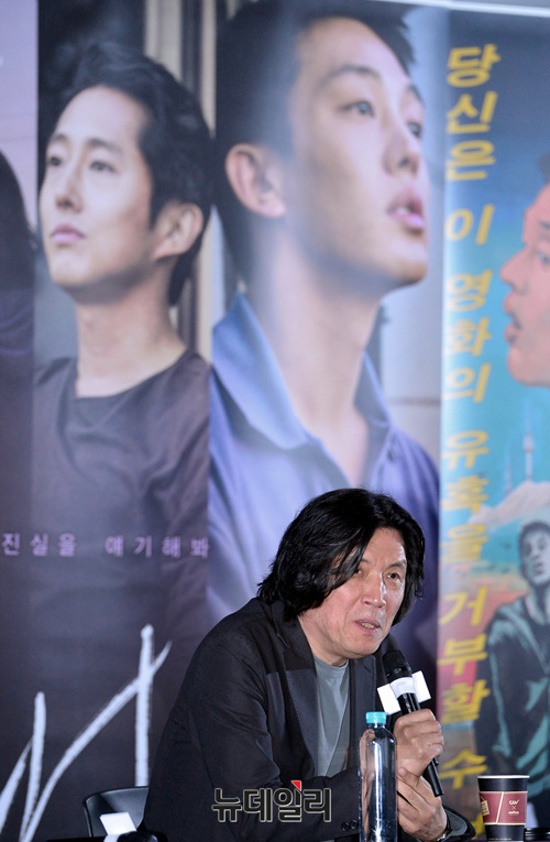 영화 '버닝(BURNING)'의 이창동 감독이 4일 오전 서울 용산CGV에서 열린 '칸 영화제 출국 전 기자회견'에 참석해 질문에 답하고 있다.