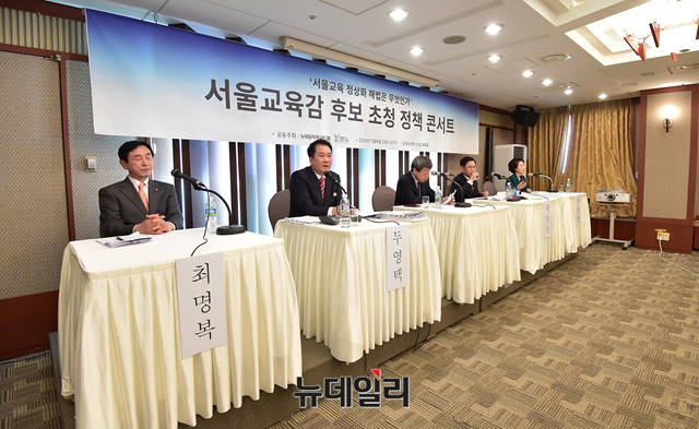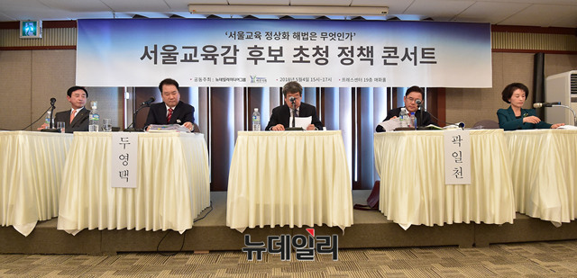 최명복, 두영택, 곽일천, 박선영(왼쪽부터) 서울시교육감 예비후보가 4일 오후 서울 중구 한국프레스센터에서 '서울교육 정상화 해법은 무엇인가'를 주제로 서울교육감 후보 초청 정책콘서트에서 정견발표를 하고 있다.이날 정책콘서트는 조동근 바른사회시민회의 공동대표의 사회로 진행된다. 토론회는 서울시교육감에 출사표를 던진 곽일천 전 서울디지텍고 교장, 두영택 광주여대 교수, 박선영 동국대 교수, 최명복 전 서울시의회 교육의원(가나다 순) 등 4명이 참석했다.뉴데일리미디어그룹과 바른사회시민회의가 공동주최하는 이번 정책토론회는 오후 3시부터 5시까지 뉴데일리 홈페이지, 뉴데일리TV(유투브), 뉴데일리 앤디(페이스북)에서 생중계 된다.