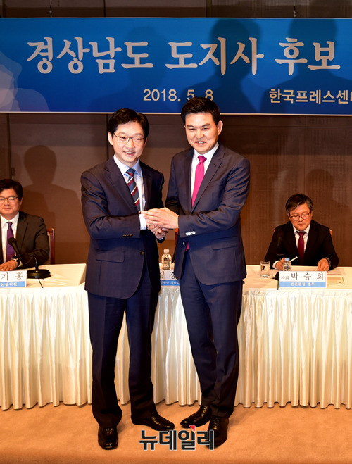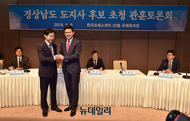 김경수 더불어민주당, 김태호 자유한국당(왼쪽부터) 경남도지사 후보가 8일 오전 서울 중구 한국프레스센터에서 열린 관훈토론회에 앞서 악수를 나누고 있다.