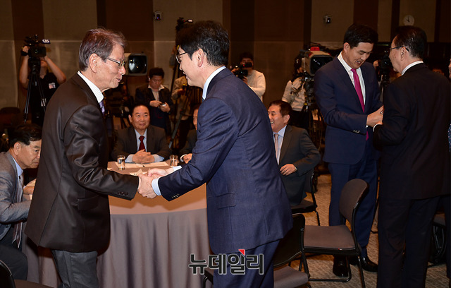 김경수 더불어민주당, 김태호 자유한국당(왼쪽부터) 경남도지사 후보가 8일 오전 서울 중구 한국프레스센터에서 열린 관훈토론회에 참석해 관계자들과 인사를 나누고 있다.