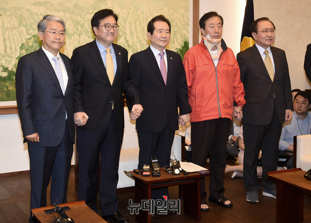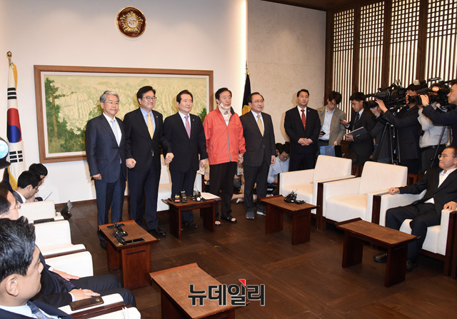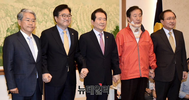정세균 국회의장과 우원식 더불어민주당, 김성태 자유한국당, 김동철 바른미래당, 노희찬 정의당 원내대표가 8일 오전 국회의장실에서 열린 교섭단체 원내대표단 회동에 앞서 기념촬영을 하고 있다.